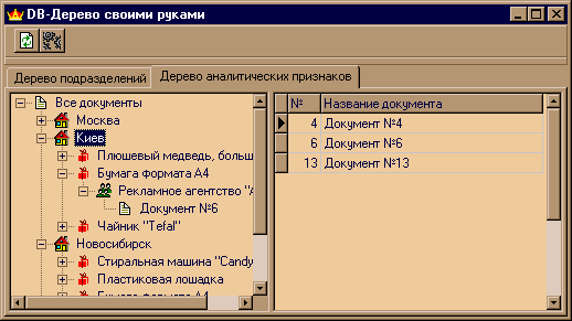"Куст — это пучок веток, растущих из одного места" Пусть у нас есть таблица документов, каждый документ, например, описывает некоторую операцию по покупке( или продаже ) товара. В этой операции участвуют: определенный товар, клиент, у которого куплен (или которому продан) этот товар, и город, в котором данная операция совершена. Таким образом, мы имеем таблицу документов, каждая запись в которой наделена тремя аналитическими признаками: Город, Клиент и Товар. По сути своей эти данные не являются иерархическими, и никакой явной зависимости между документами не прослеживается. Но тем не менее эта связь существует — одинаковые аналитические признаки. Например, в одну группу можно объединить все документы, имеющие отношение к определенному товару или клиенту. Если для анализа данных пользователю необходимо работать с документами по зафиксированным аналитическим признакам, то возникает задача визуального представления таких данных. К примеру, заказчик требует показывать ему все документы для определенного города, а потом, для определенного клиента и товара, но в том же городе. Однако желательно видеть информацию ровно в обратном порядке: сначала выбрать документы с нужным товаром, затем увидеть все города, где работали с этим товаром, выбирать нужный город и так далее. Явно прослеживается древовидная структура, где каждый уровень дерева суть аналитический признак. Именно поэтому, как говорилось выше, в данном дереве фиксирована глубина вложенности. Она однозначно определяется количеством аналитики для документа. Описание примера, реализующего данную задачу Используемые таблицы: Таблица документов DOCUMENTS.DB , где каждый документ определен полями: