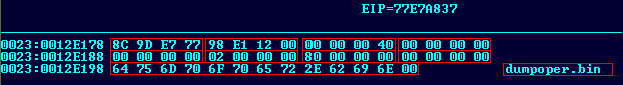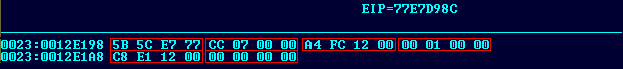 Должно это выглядеть как-то так. Функция на языке Си выгледит так: CreateFileA(&filename, 0x40000000, 0, 0, 2, 0x80, 0); 8C 9D E7 77 – это адрес возврата (на функцию WriteFile = 77E79D8C), туда попадаем после завершения функции CreateFileA. По адресу 0012E198 (98 E1 12 00) находится имя файла завершающееся нулевым символом. Этот файл должен сущуствовать. Теперь ставим указатель на начало функции CreateFileA.