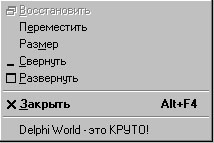 AppendMenu(GetSystemMenu(Handle, FALSE), MF_STRING, SC_MyMenuItem, 'Delphi World - это КРУТО!');